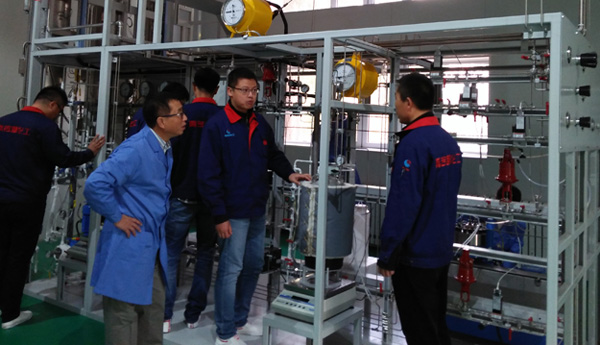 奧吉娜化工研發(fā)人員試驗(yàn)裝置現(xiàn)場(chǎng)討論