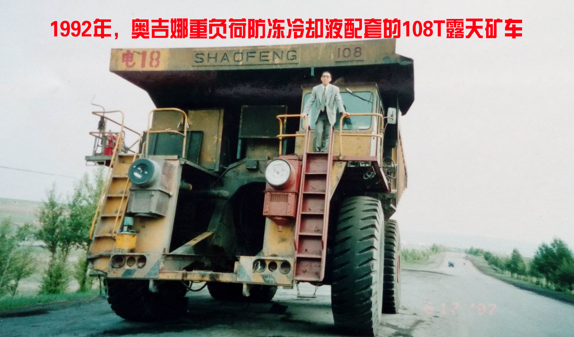? 1991年,在奧吉娜總裁魏國(guó)平博士的帶領(lǐng)下,奧吉娜研制生產(chǎn)出奧吉娜乙二醇基SCA型重負(fù)荷發(fā)動(dòng)機(jī)防凍冷卻液,1992年,該產(chǎn)品配套露天礦重載自卸車。魏國(guó)平博士在裝配奧吉娜重負(fù)荷防凍液的108噸露天礦車上。
