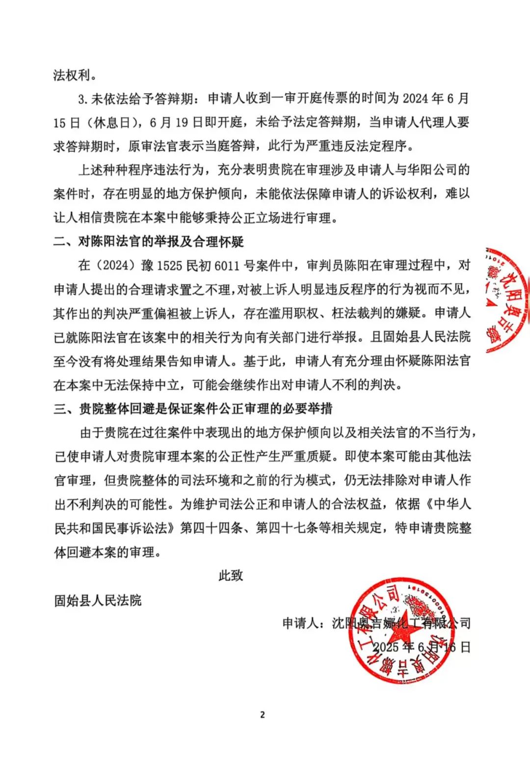 11、2025年6月13日,奧吉娜公司收到固始縣法院2025年7月4日開庭傳票。2025年6月16日,奧吉娜公司以郵寄方式向固始縣法院遞交《回避申請書》,請求固始縣法院依法整體回避(2025)豫1525民初4949號名譽權糾紛一案的審理。