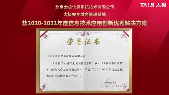 “太極安全域名管理系統(tǒng)”曾榮獲2020—2021年度信息技術(shù)應用創(chuàng)新優(yōu)秀解決方案